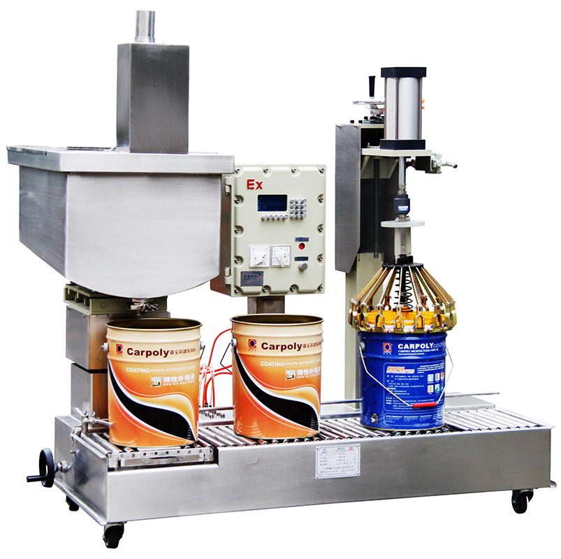 Suitable for filling tins, canisters and pails of 1 to 30 liters below 100kg, powered roller conveyor; filling of open round plastic barrels within 50kg, small round cans and small square cans can also be adapted.